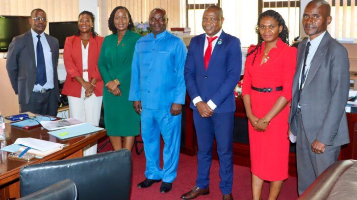The Director General Mr. Fredrick Change (in red necktie) alongside NPC Commissioner Dr. Betty Chinyamunyamu (in green dress) and other NPC team members with Minister of Lands, Housing and Urban Development Honourable Jappie Mhango, MP after a courtesy meeting where the issue of Special Economic Zones was also discussed.